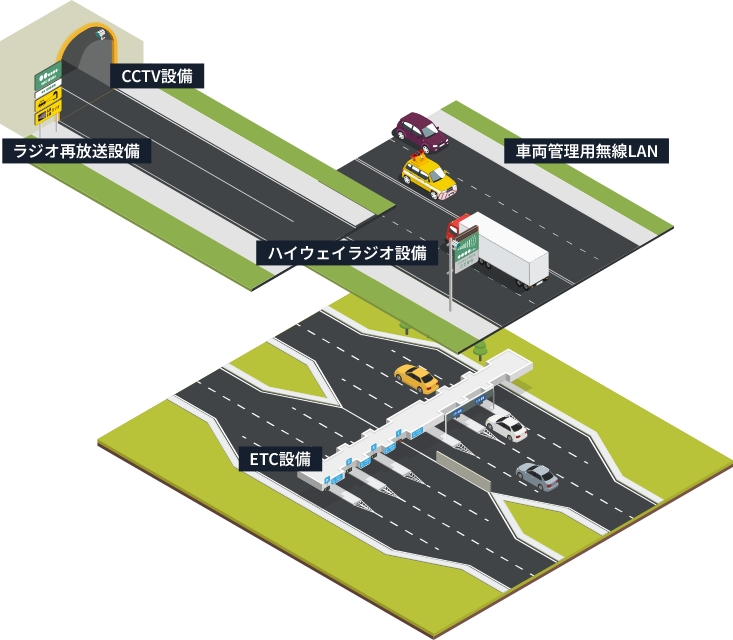 ETC設備、CCTV設備、ラジオ再放送設備、ハイウェイラジオ、車両管理用無線LANなど。
